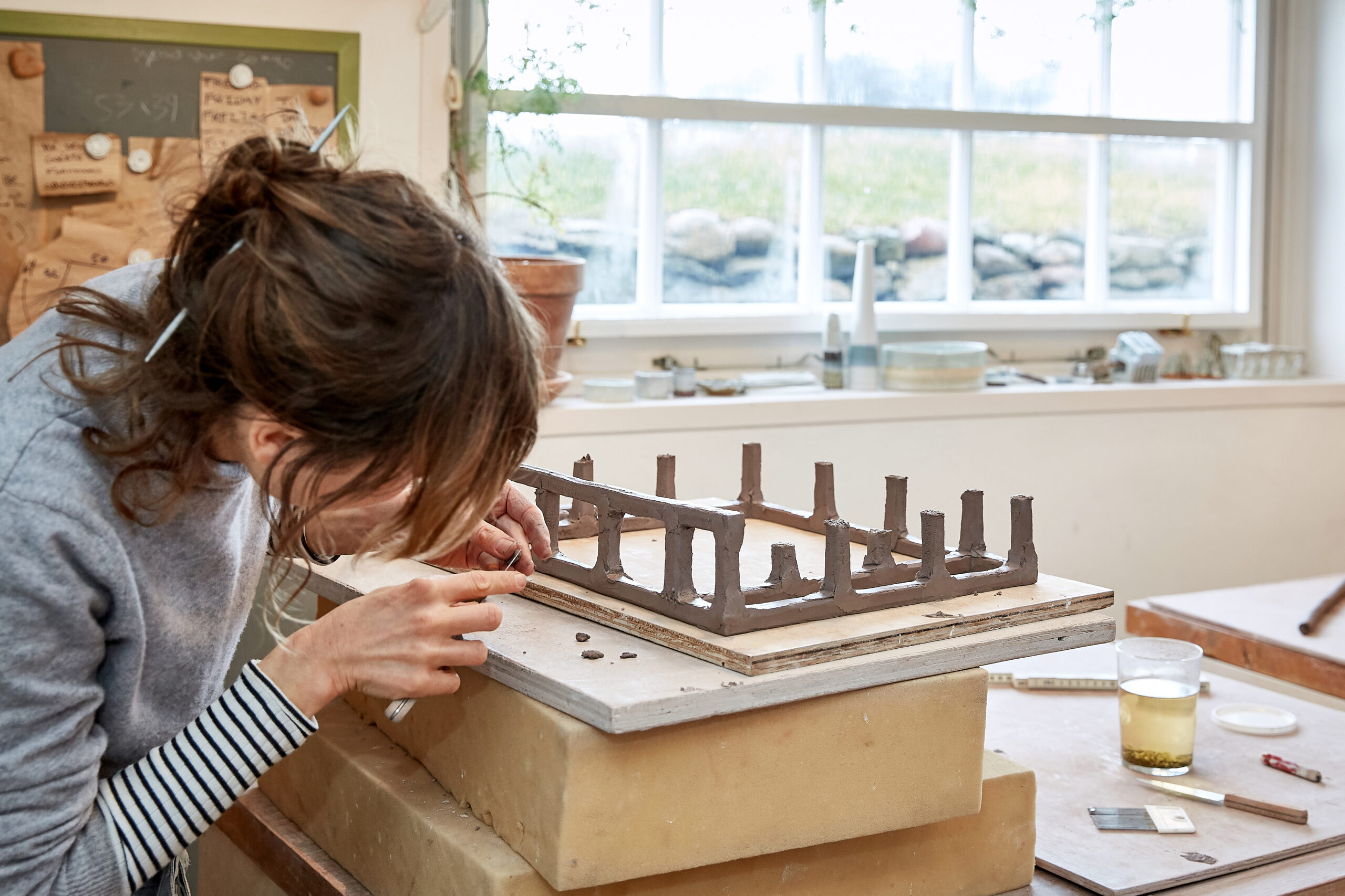 “En fascination af gentagelser, rum og proportioner kommer til udtryk i mit arbejde med leret. Jeg skaber skulpturelle værker, der leder tankerne hen på arkitektur, geometri og mønstre. Jeg tager udgangspunkt i lerets basale kvaliteter. Ved at efterlade spor og mærker fra tilblivelsen bevares lerets kvalitet som materiale i værket.”